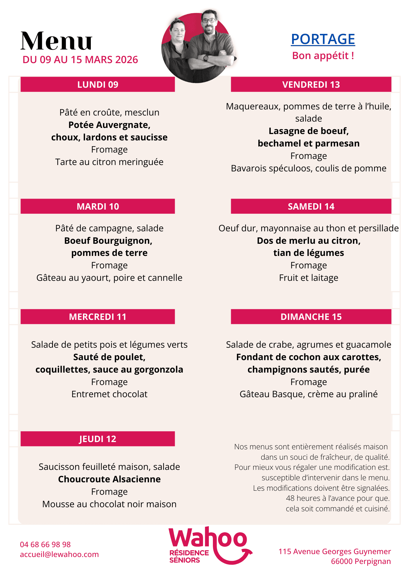 Le portage de repas à votre domicile s’effectue chaque matin et le menu change toutes les semaines. Au programme, des menus savoureux, sains et complets avec des plats adaptés à votre régime alimentaire (diabète, cholestérol, sans sel, etc.).